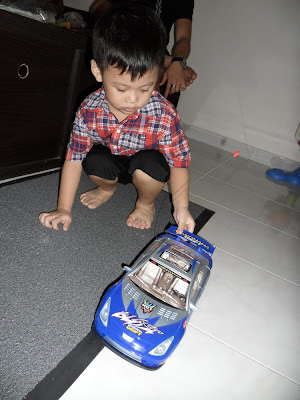 His uncle was saying remote and he has phobia then walked away! Everyone thought the prezzie would be wasted, end up he get convinced by playing with it and even made the wheels spoilt!