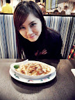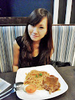 Xuan En with her chicken chop baked rice. Don't ever try pork chop okay? Super hard!